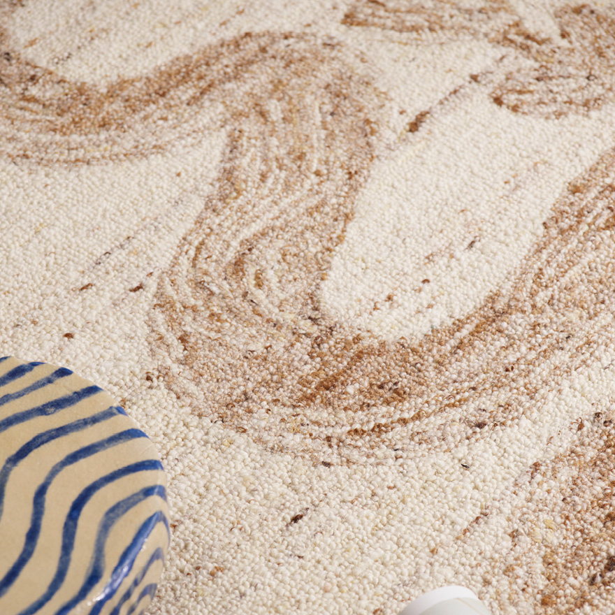 Håndtuftet i 100% ull. Bakside i 100% resirkulert bomull.